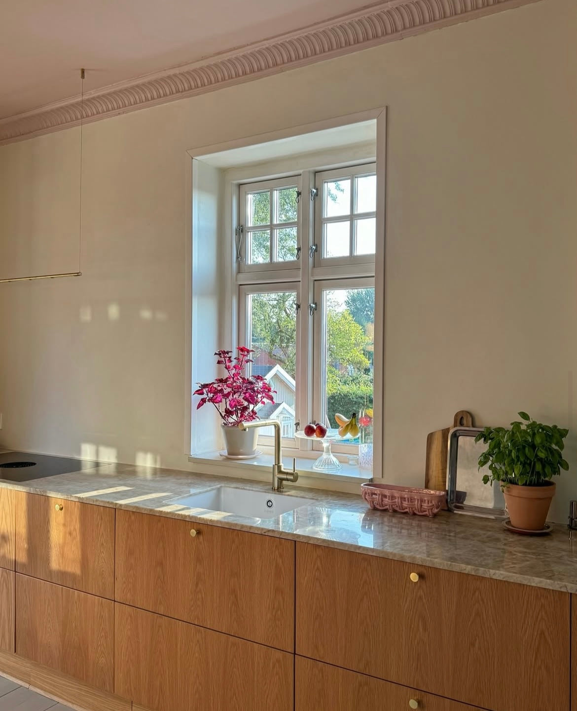 Køkkenets vægge er malet i Hvid Morbær, en rolig nuance, der lader materialerne træde smukt frem. Bordpladen i marmor og køkkenets varme træ skaber tilsammen et tidløst og afbalanceret udtryk.